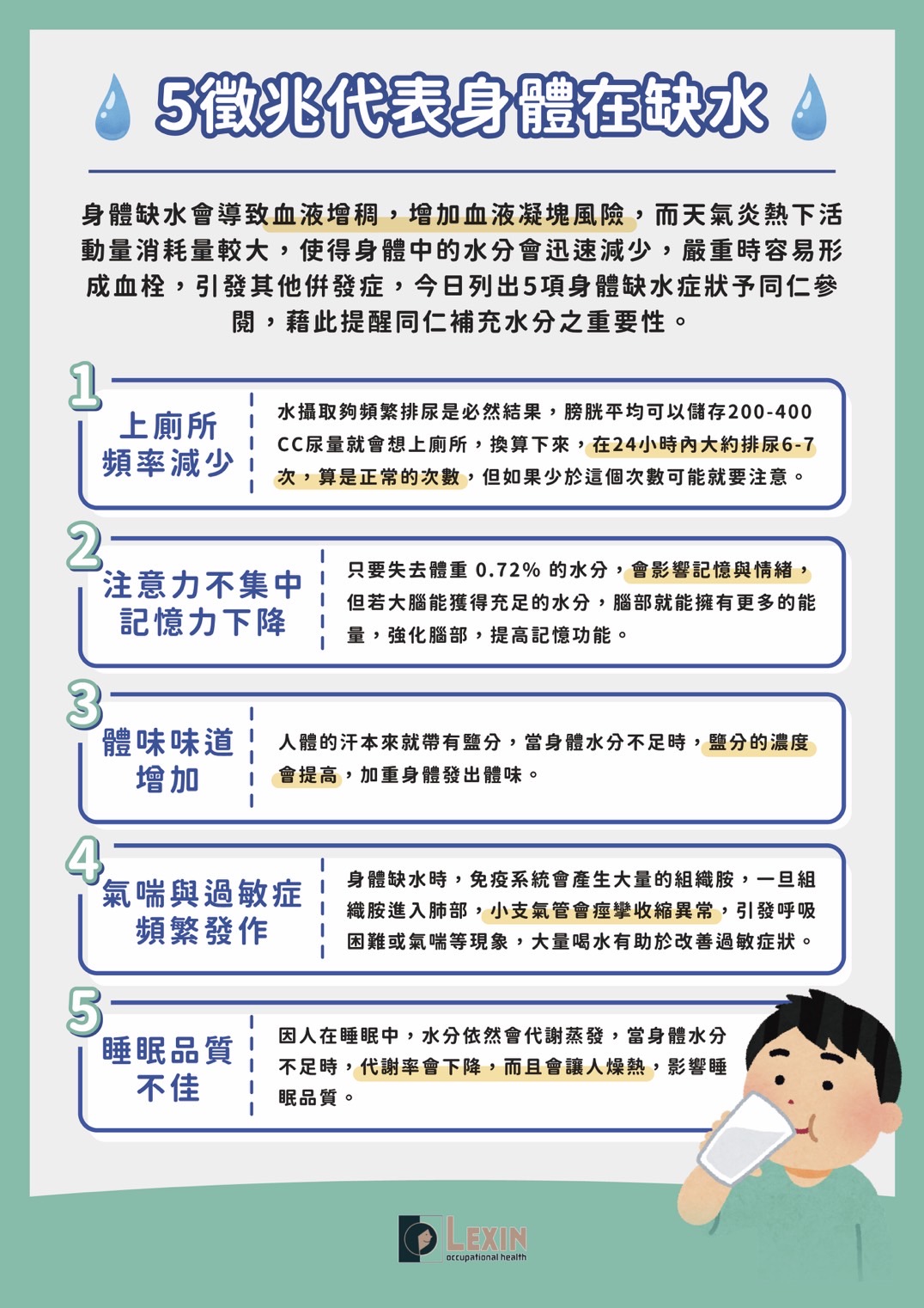 💧 你今天喝水了嗎? 身體缺水不只是「口渴」而已,還會悄悄出現一些警訊! 像是: 1️⃣ 上廁所次數變少 2️⃣ 注意力不集中、記憶力下降 3️⃣ 體味道變重 4️⃣ 氣喘、過敏症狀變頻繁 5️⃣ 睡眠品質不佳 這些都是身體在提醒你「該補水囉」! 👉 記得每天隨時補充足夠水分,讓身體保持最佳狀態。
